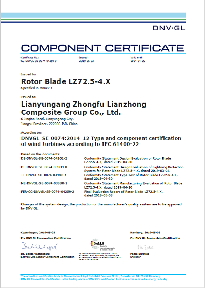 近日,中復(fù)連眾收到了DNV GL德國(guó)總部發(fā)布的LZ72.5-4.X風(fēng)電葉片型式認(rèn)證A證書。該證書是迄今為止DNV GL頒發(fā)給國(guó)內(nèi)的首張符合IEC標(biāo)準(zhǔn)的4MW級(jí)別部件型式認(rèn)證證書,這標(biāo)志著國(guó)際權(quán)威機(jī)構(gòu)對(duì)中復(fù)連眾綜合研發(fā)實(shí)力和制造品質(zhì)的充分認(rèn)可。另外該型號(hào)也是目前國(guó)內(nèi)獲得DNV GL A型式認(rèn)證證書中長(zhǎng)度最長(zhǎng)、功率最高的葉片。