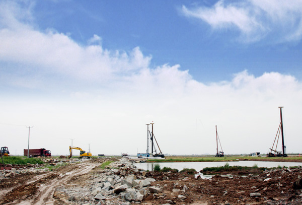 工程部徐經(jīng)理介紹到,中復(fù)新水源徐圩項目是徐圩新區(qū)基礎(chǔ)建設(shè)工程,包括一個面積為139.7畝的水廠,一個面積為144畝的污水處理廠和外圍配套管網(wǎng)120公里,總工期14個月。項目部組建已經(jīng)一個月了,項目前期建設(shè)事宜正在按計劃推進,專家隊伍、管理隊伍已經(jīng)就位;樁基工程正在施工;土建工程已經(jīng)發(fā)出招標公告;設(shè)備正在編制清單和技術(shù)規(guī)格書。項目地處徐圩鹽田,地質(zhì)條件復(fù)雜,地表至負13米左右均為淤泥層,承載力差,累計要打下十萬多米的樁基。