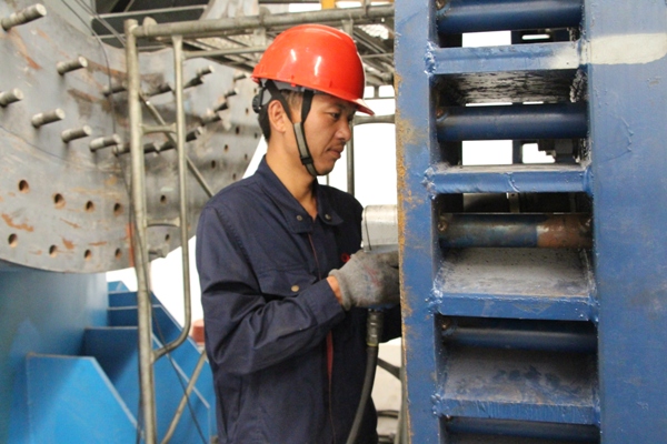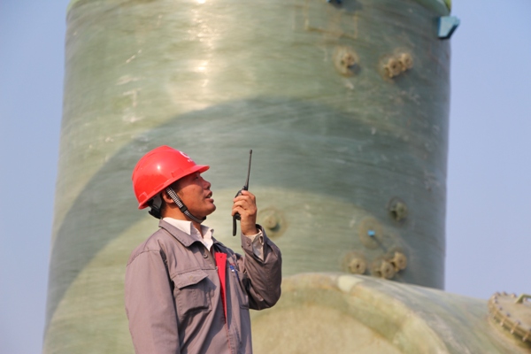 “張斯偉,你們班生產(chǎn)情況如何,有沒有人員中暑?”“報告熊經(jīng)理,人員一切正常,保證下班前完成MK-09號罐體纏繞結(jié)束”纏繞班長張斯偉用手抹了一把臉上的汗水答道。 “范成雷,現(xiàn)場情況如何,今晚能否完成1號平臺的法蘭對接?”“報告熊經(jīng)理,人員一切正常,保證今晚保質(zhì)保量的完成任務(wù)”,手糊二班范成磊回答道。像這樣的詢問和關(guān)心還有很多很多,不管是在室溫高達四十二度的纏繞車間還是在六十二米高的玻璃鋼煙囪手糊對接處,你都能看到虎山項目部經(jīng)理熊國慶的身影。