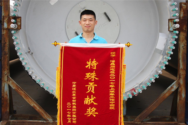 7月17日,周一早上八點(diǎn),這是中復(fù)連眾連云港葉片工廠各班組召開例行晨會(huì)的時(shí)間。機(jī)加工工段晨會(huì)最后一項(xiàng)議程,是一個(gè)簡(jiǎn)單而隆重的表彰儀式,質(zhì)量總監(jiān)王利將一面“特殊貢獻(xiàn)獎(jiǎng)”的錦旗頒發(fā)給了機(jī)加工成品10班班長(zhǎng)潘晶。這錦旗背后,有著一個(gè)怎樣的故事?