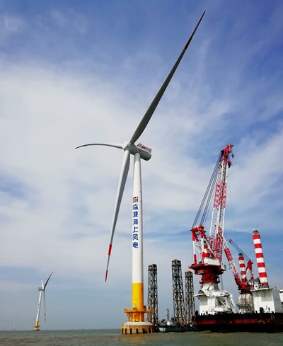 5月9日,上海臨港海上風電一期示范項目首臺風電機組成功完成吊裝,該機組為上海電氣6.25-172海上風機,是全球已吊裝的葉輪直徑最大的海上風機。此機組葉片由中復連眾制造,單只葉片長84米,功率6.25兆瓦,是全球最長玻纖增強葉片。