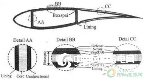 目前大型風電葉片的結(jié)構(gòu)都為蒙皮主梁形式,如圖1所示為典型的葉片構(gòu)造形式。蒙皮主要由雙軸復合材料層增強,提供氣動外形并承擔大部分剪切載荷。后緣空腔較寬,采用夾芯結(jié)構(gòu),提高其抗失穩(wěn)能力,這與夾芯結(jié)構(gòu)大量在汽車上應(yīng)用類似。主梁主要為單向復合材料層增強,是葉片的主要承載結(jié)構(gòu)。腹板為夾芯結(jié)構(gòu),對主梁起到支撐作用。