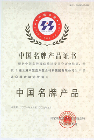2006年9月6日,由國家質(zhì)量監(jiān)督檢驗檢疫總局主辦,中國名牌推進委員會承辦的國務(wù)院《質(zhì)量振興綱要》實施十周年暨中國名牌產(chǎn)品、質(zhì)量興市先進表彰大會在北京人民大會堂順利召開。中復(fù)連眾生產(chǎn)的“連眾”牌玻璃鋼管道喜獲“中國名牌”稱號,喬光輝總經(jīng)理上臺領(lǐng)取了獎牌和證書。這是暨2005年獲得江蘇省著名商標以來“連眾”牌玻璃鋼管道獲得的又一殊榮。