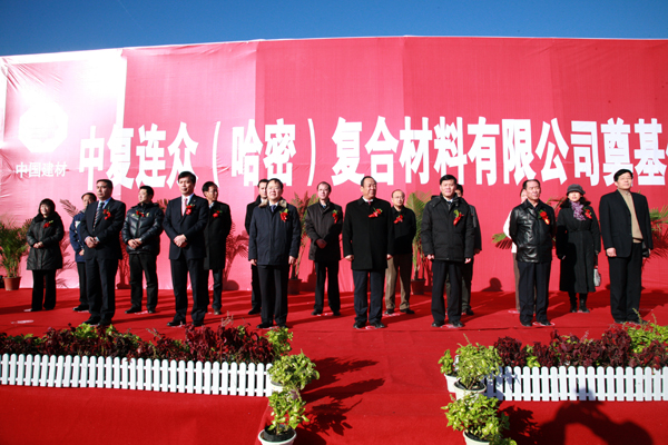 中國(guó)建材集團(tuán)副總經(jīng)理郭朝民、中國(guó)建材報(bào)社社長(zhǎng)陳才來、中國(guó)復(fù)合材料集團(tuán)公司董事長(zhǎng)、總經(jīng)理張定金、哈密地委書記郭連山、哈密地區(qū)政協(xié)工委主任魏天哲、哈密行署副專員牙森·斯地克等出席奠基儀式。中國(guó)復(fù)合材料集團(tuán)公司副總經(jīng)理、連云港中復(fù)連眾集團(tuán)公司董事長(zhǎng)任桂芳主持儀式。